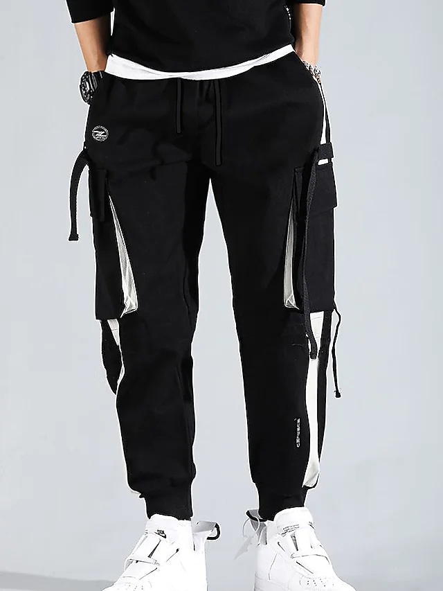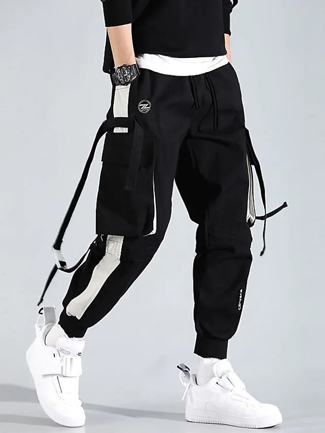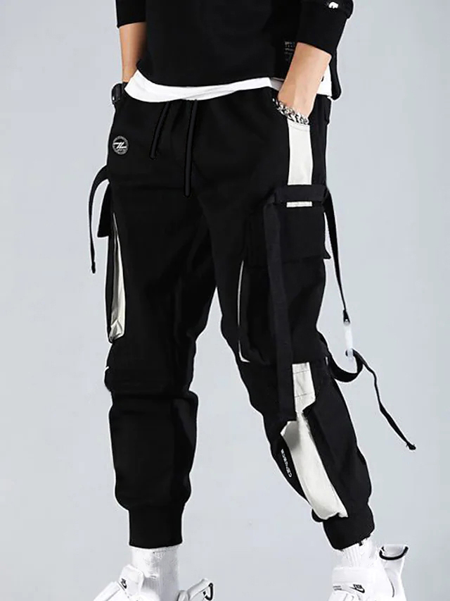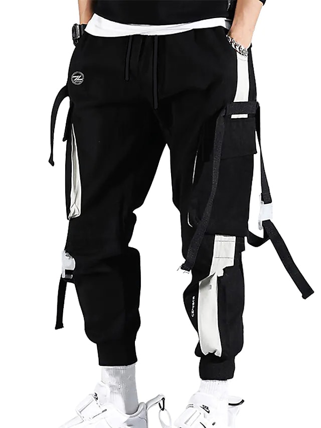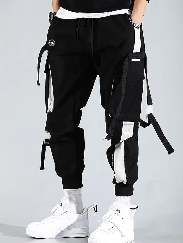 men's cargo pants Streetwear Embroidery Color Block Cotton jogging pants Trousers With Multi-pockets ribbon hiphop punk joggers sweatpants sport harem pants spring Fall