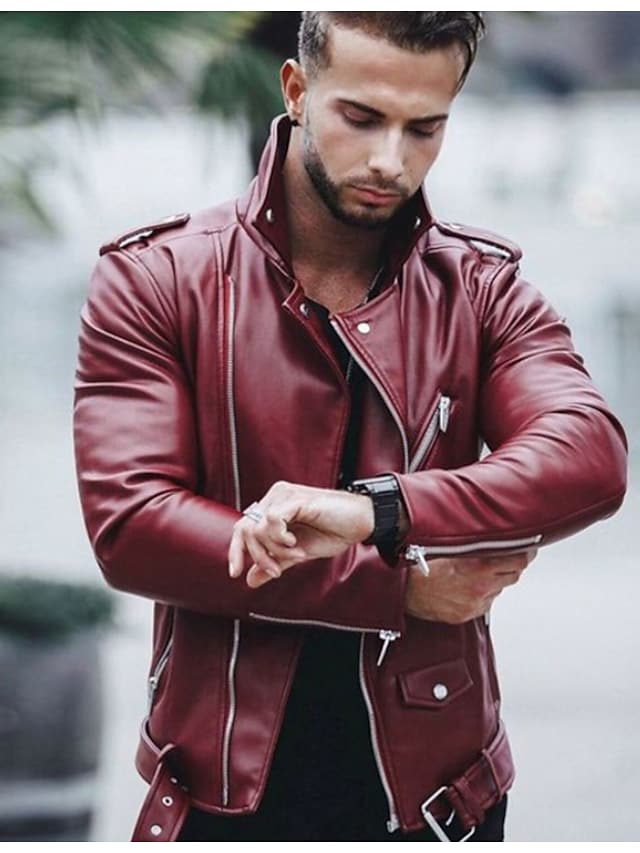 Men's Faux Leather Jacket Daily Regular Coat Regular Fit Jacket Long Sleeve Solid Colored Black Wine / Plus Size