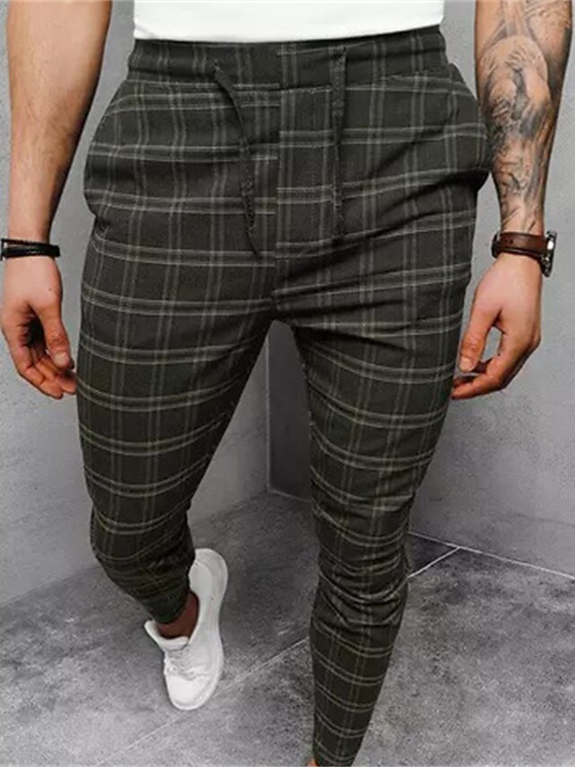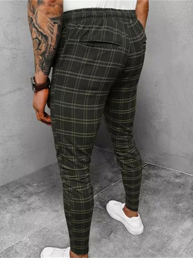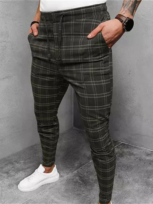 Men's Joggers Trousers Casual Pants Drawstring Elastic Waist Grid / Plaid Comfort Breathable Pants Casual Daily Cotton Blend Sports Fashion Green Micro-elastic