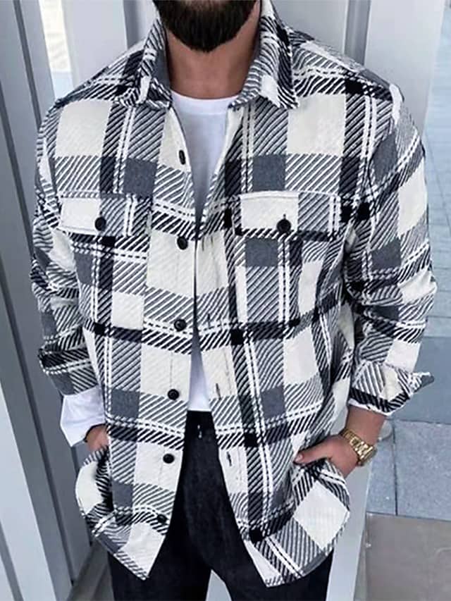 Men's Shirt Jacket Plaid / Check Turndown Black Long Sleeve Outdoor Street Pocket Tops Streetwear Sporty Casual / Fall