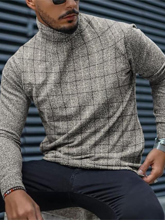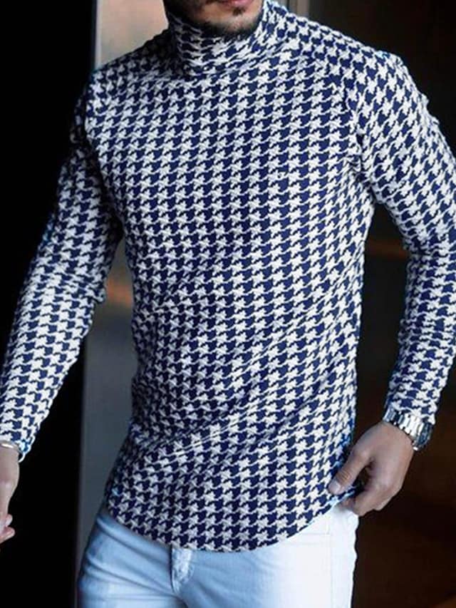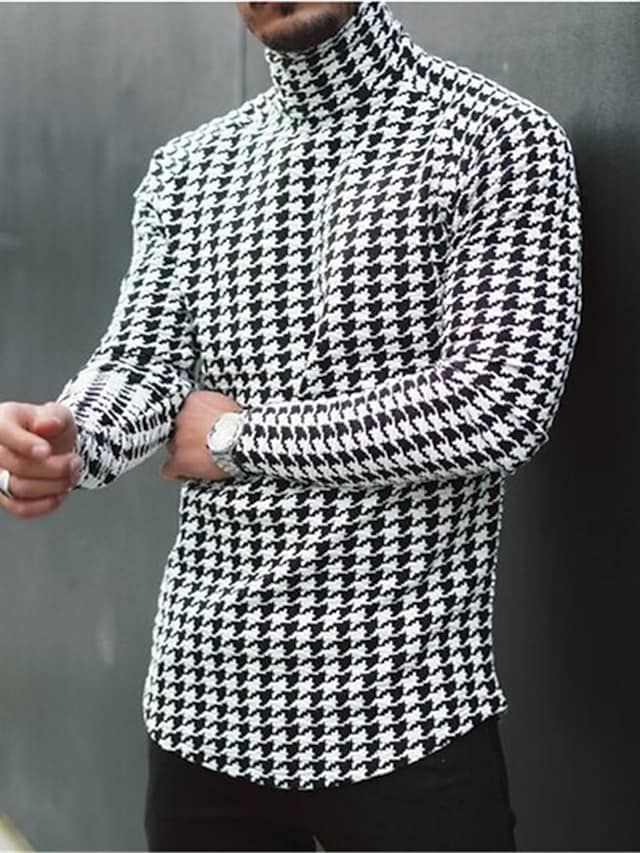 Men's T shirt Tee Plaid Houndstooth Turtleneck Black / White Black Blue Gray Yellow Long Sleeve Casual Daily Tops Lightweight Muscle Slim Fit Big and Tall